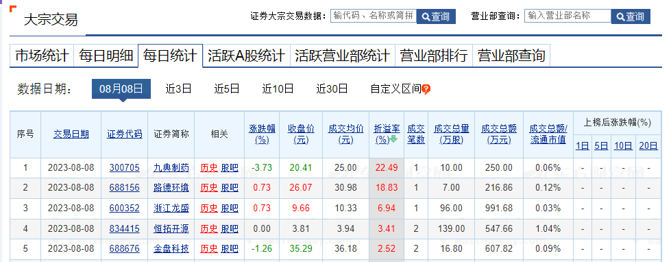 上证报中国证券网讯 据东方财富Choice数据,8月8日,A股共60只个股发生大宗交易,总成交12.53亿元。九典制药、路德环境、浙江龙盛溢价率居前,华阳变速、浩通科技、普瑞眼科折价率居前。