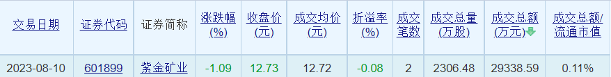 紫金矿业昨日大宗交易成交2306.48万股 成交额2.93亿元