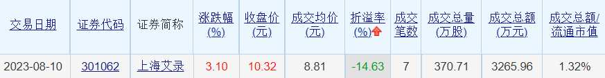 上海艾录昨日大宗交易折价成交3265.96万元 折价率14.63%