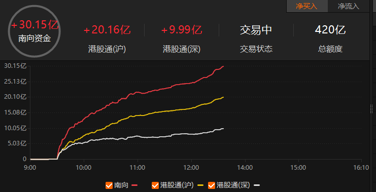上证报中国证券网讯 8月30日13时36分,南向资金净买入超30亿港元,达到30.15亿港元。