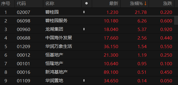 上证报中国证券网讯 据Choice金融终端数据,9月6日午后,恒生地产指数拉升,涨0.76%。截至13时12分,碧桂园涨超20%,碧桂园服务涨逾6%,龙湖集团涨超5%,中国海外发展涨逾2%,华润万象生活等跟涨。