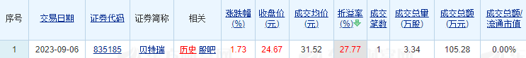 上证报中国证券网讯 据东方财富Choice数据,贝特瑞9月6日大宗交易3.34万股,成交金额105.28万元,成交均价31.52元,溢价率27.77%。