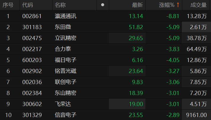 消费电子板块震荡下挫 瀛通通讯跌近9%