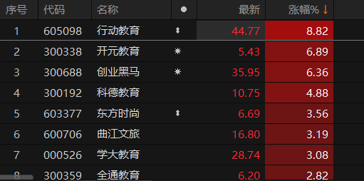 上证报中国证券网讯 据Choice金融终端数据,9月7日早盘,申万一级行业板块中,社会服务板块拉升。截至10时13分,行动教育涨逾8%,开元教育、创业黑马涨超6%,科德教育涨逾4%,东方时尚、曲江文旅等涨超3%。