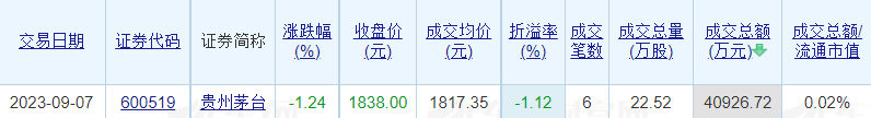 贵州茅台昨日大宗交易折价成交22.52万股 成交额4.09亿元
