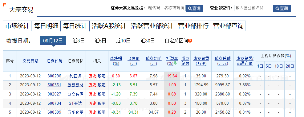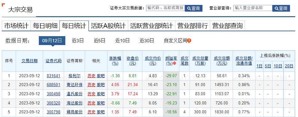 上证报中国证券网讯 据东方财富Choice数据,9月12日共62只个股发生大宗交易,总成交17.94亿元。利亚德、创新新材、分众传媒溢价率居前;格利尔、青达环保、温氏股份折价率居前。