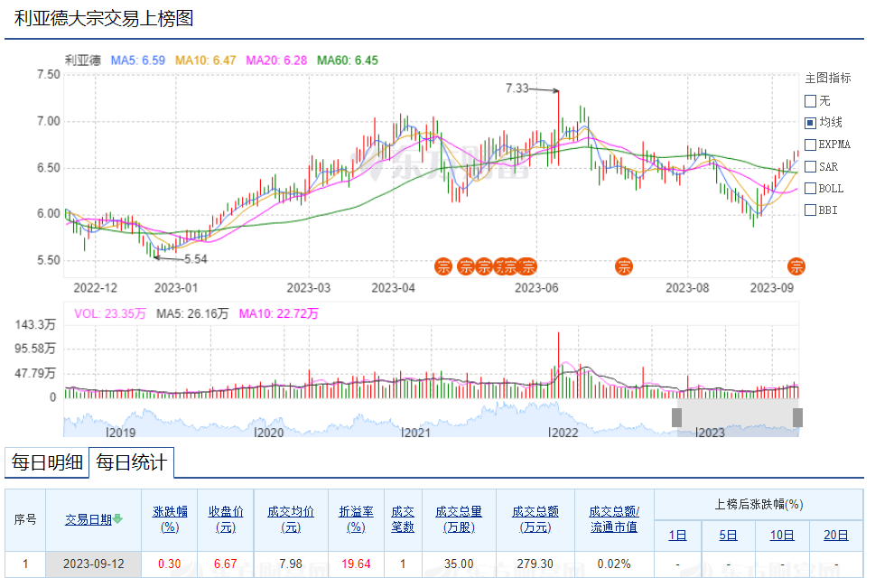 利亚德昨日大宗交易成交35万股 溢价率19.64%