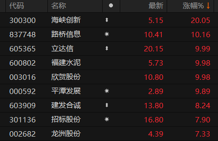 上证报中国证券网讯 9月13日,A股福建板块开盘活跃,海峡创新、路桥信息、立达信、福建水泥等多股一字封板。消息面上,《中共中央 国务院关于支持福建探索海峡两岸融合发展新路 建设两岸融合发展示范区的意见》9月12日发布。