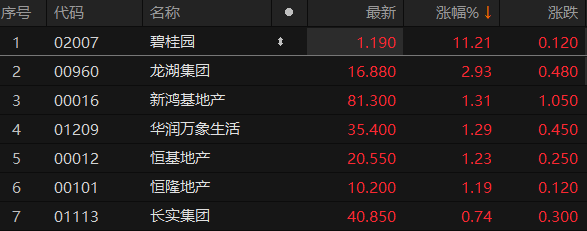 香港恒生地产指数走高 碧桂园涨逾11%