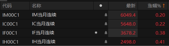 上证报中国证券网讯 10月11日早盘,股指期货普涨。9时33分,中证1000股指期货(IM)主力合约上涨0.2%,中证500股指期货(IC)主力合约上涨0.22%,沪深300股指期货(IF)主力合约上涨0.38%,上证50股指期货(IH)主力合约上涨0.41%。