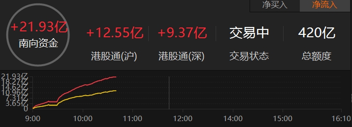 上证报中国证券网讯 10月13日10时41分,南向资金净流入超20亿港元,达到21.93亿港元。