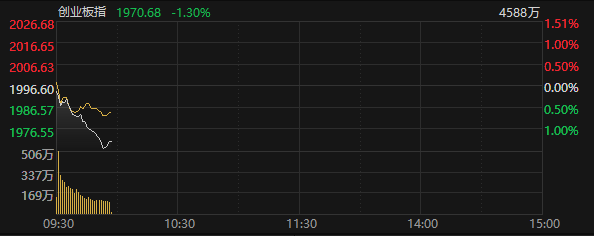 上证报中国证券网讯 据Choice金融终端数据,截至10月16日9时56分,创业板指数跌超1%,跌幅扩大至1.3%,报1970.68点。