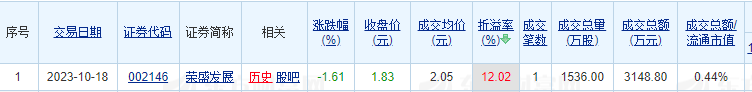 上证报中国证券网讯 据东方财富Choice数据,荣盛发展10月18日大宗交易1536万股,成交金额3148.80万元,成交价2.05元/股,相对当日收盘价溢价率为12.02%。