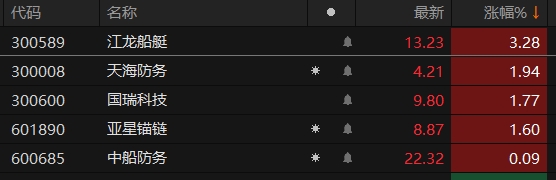 上证报中国证券网讯 10月25日,A股中船系个股普涨。14时06分,江龙船艇上涨3.28%,天海防务、国瑞科技、亚星锚链涨超1%。