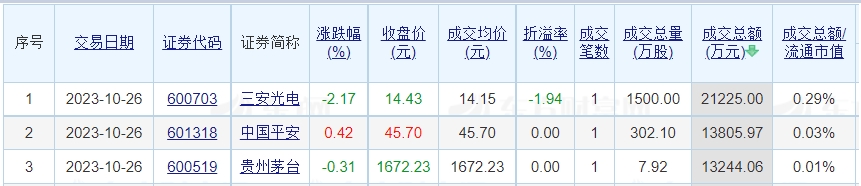 昨日A股共76只个股发生大宗交易 三安光电、中国平安、贵州茅台成交额居前