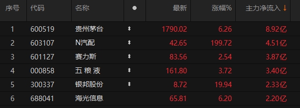 上证报中国证券网讯 截至11月1日午间收盘,6只A股的主力资金净流入额超过2亿元。其中,贵州茅台净流入近9亿元,表现居首。