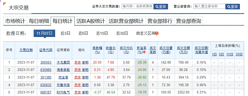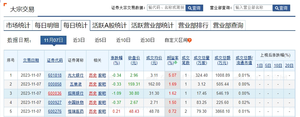上证报中国证券网讯 据东方财富Choice数据,11月7日A股共75只个股发生大宗交易,总成交9.92亿元。光大银行、五粮液、招商银行溢价率居前;天龙集团、海泰新能、挖金客折价率居前。