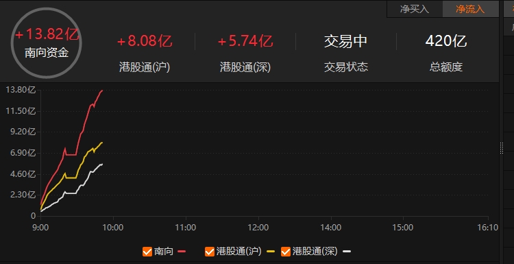 上证报中国证券网讯 11月8日9时51分,南向资金净流入超10亿港元,达到13.82亿港元。