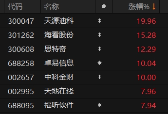 上证报中国证券网讯 11月8日上午交易时段,A股国产软件概念震荡走高。11时10分,天源迪科20cm涨停。海看股份涨超15%,思特奇涨超12%,卓易信息涨超10%。