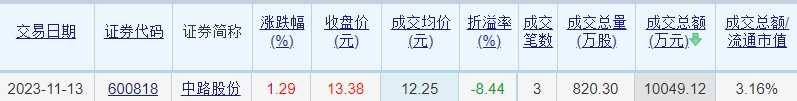 中路股份昨日大宗交易折价成交820.3万股 成交额1.0亿元