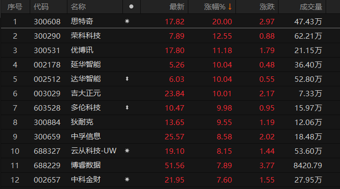 上证报中国证券网讯 Choice数据显示,今日早盘计算机板块领涨,截至发稿板块指数上涨超1.6%,板块内思特奇20%涨停,优博讯、荣科科技涨超11%,延华智能、达华智能、吉大正元等涨停。