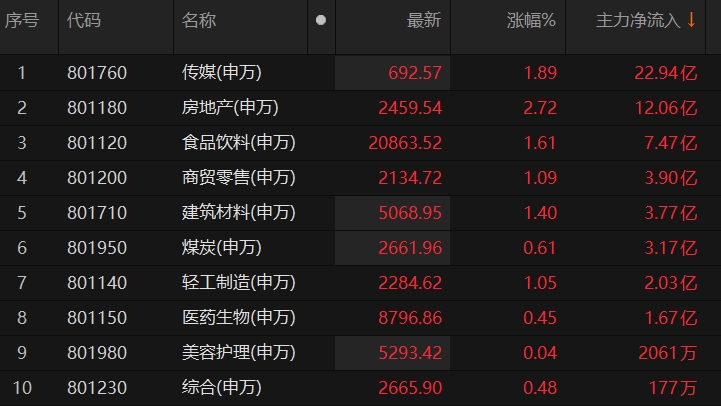 主力资金净流入10大板块 传媒板块净流入超22亿元