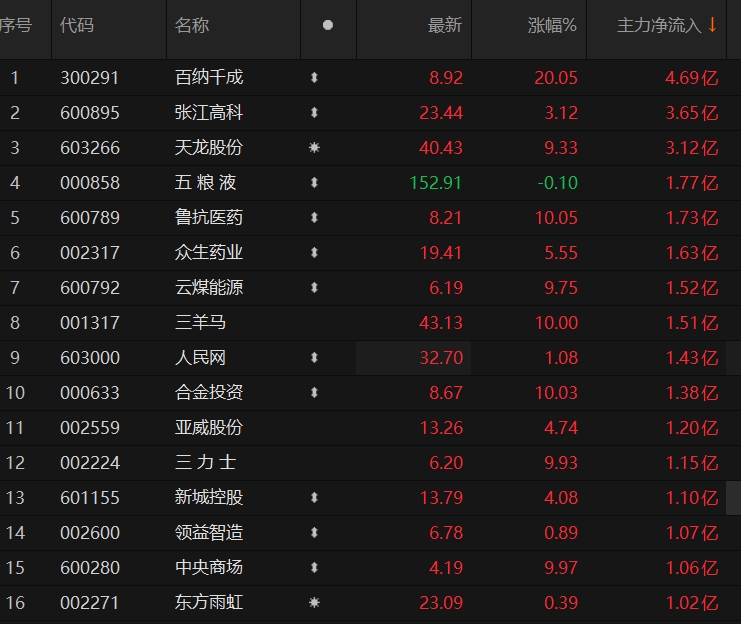 16只个股主力资金净流入超1亿元 百纳千成净流入超4亿元居首