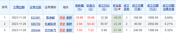 成交价方面,固德威、东睦股份溢价率居前,溢价率依次为0.59%、0.29%;奥迪威、东威科技、双杰电气折价率居前,折价率依次为40.03%、22.29%、21.44%。