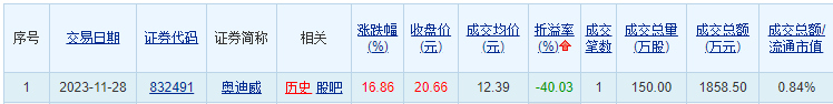 奥迪威昨日大宗交易成交1858.5万元 折价率40.03%