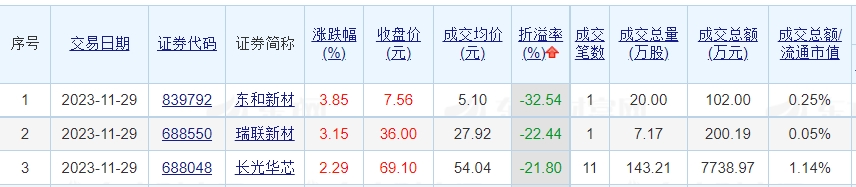 成交价方面,东方园林、*ST全筑、群兴玩具溢价率居前,溢价率依次为12.98%、10.85%、8.43%;东和新材、瑞联新材、长光华芯折价率居前,折价率依次为32.54%、22.44%、21.8%。