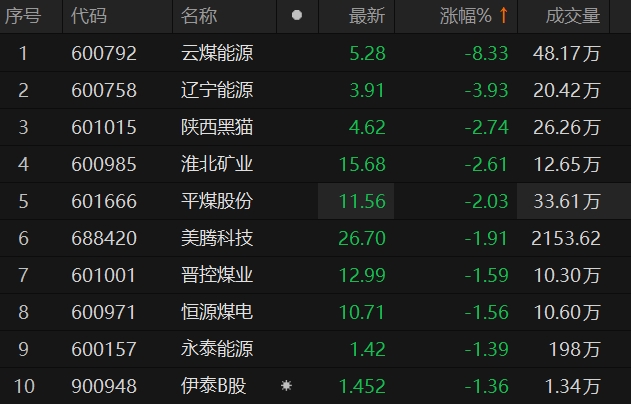 上证报中国证券网讯 11月30日,煤炭板块震荡下挫,截至10时42分,云煤能源跌超8%,辽宁能源、陕西黑猫、平煤股份等跟跌。