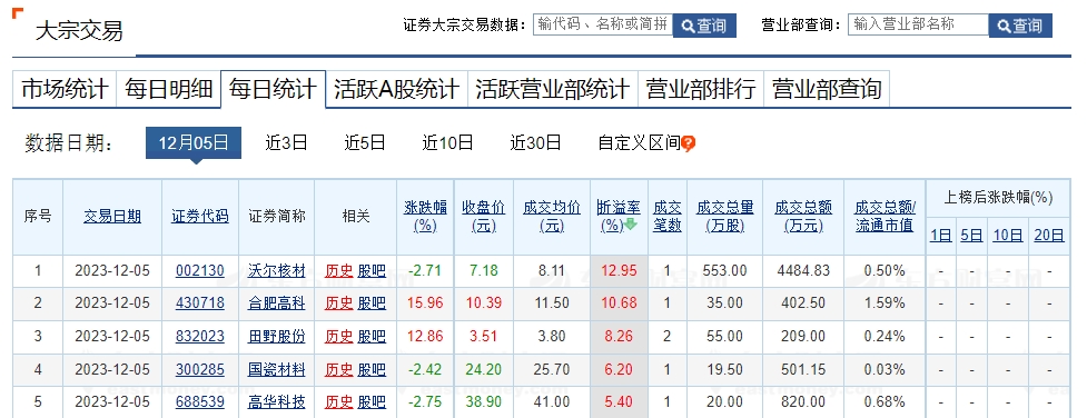 上证报中国证券网讯 据东方财富Choice数据,昨日(12月5日)A股大宗交易总成交12.62亿元。当日溢价率最高个股为沃尔核材,折价率最高个股为广脉科技。