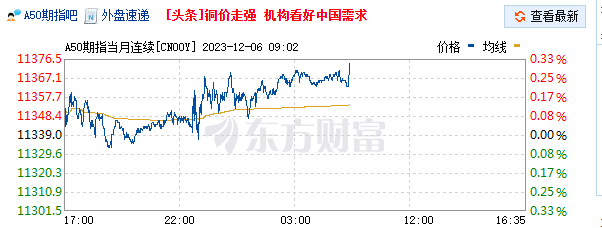 上证报中国证券网讯 12月6日,富时中国A50指数期货主力合约在上一交易日夜盘收涨0.21%的基础上高开,截至9时2分,该指数涨0.24%。