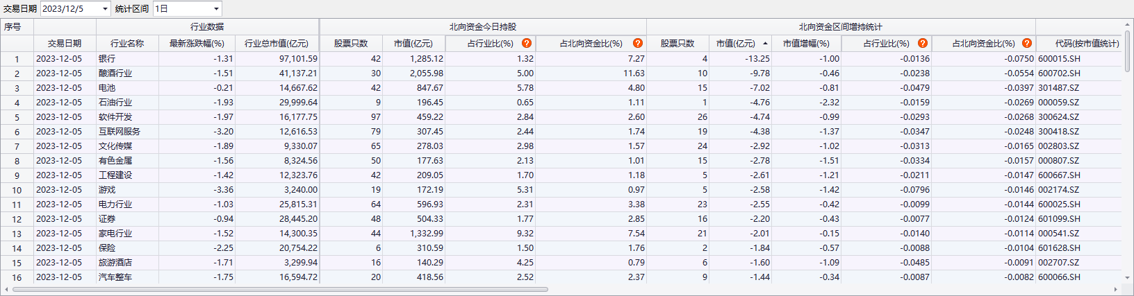 上证报中国证券网讯 Choice数据统计,昨日(12月5日)北向资金加仓前三的行业是半导体、煤炭行业、中药,分别加仓7.22亿元、2.25亿元、1.96亿元;减持前三的行业是银行、酿酒行业、电池,分别减持13.25亿元、9.78亿元、7.02亿元。