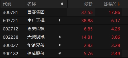 上证报中国证券网讯 12月6日上午交易时段,A股短剧互动游戏概念拉升。10时16分,因赛集团涨超17%,此前一度20CM涨停,中广天择、思美传媒等多股跟涨。