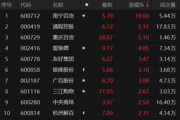 上证报中国证券网讯 12月12日,零售股拉升,截至9时42分,南宁百货2连板,重庆百货、通程控股涨超5%,友好集团、广百股份等多股涨超3%。