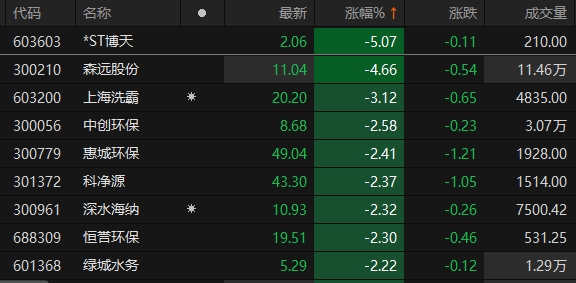 上证报中国证券网讯 12月21日早盘,申万一级行业板块中,环保板块开盘走低。截至9时38分,*ST博天跌停。森远股份跌超4%,上海洗霸跌逾3%,中创环保、惠城环保、科净源等多股跌超2%。