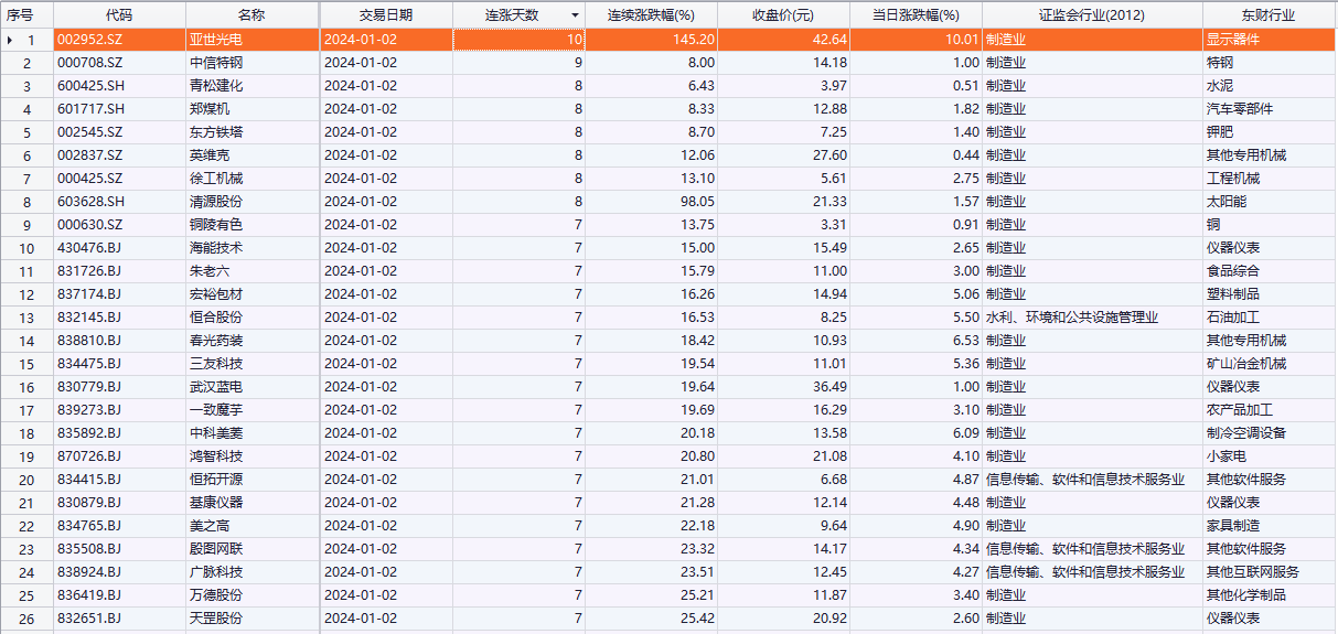 上证报中国证券网讯 据Choice数据统计,今日1只个股连续10天上涨,为亚世光电;1只个股连续9天上涨,为中信特钢;此外,郑煤机、青松建化、东方铁塔等6只个股连续8天上涨。