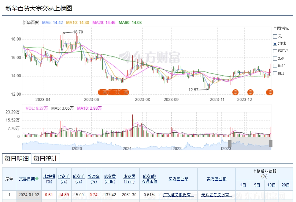 新华百货昨日大宗交易成交137.42万股 溢价率0.74%