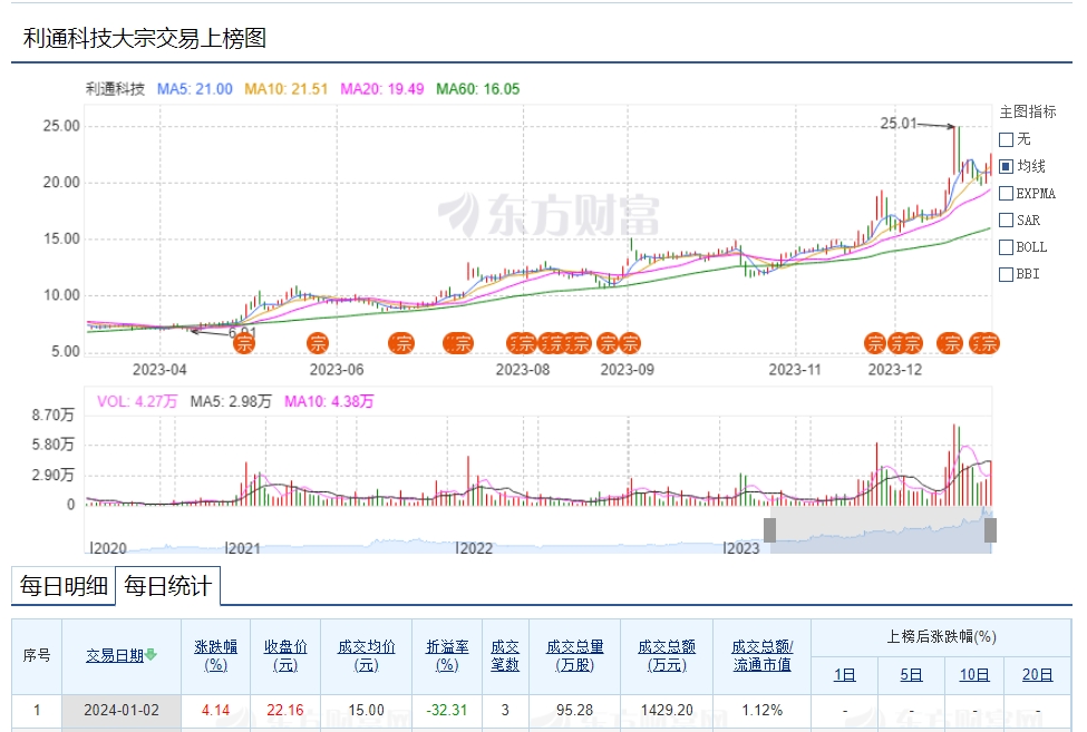 上证报中国证券网讯 据东方财富Choice数据,昨日(1月2日),利通科技发生3笔大宗交易,总成交95.28万股,成交总额1429.2万元,成交均价15.00元,较当日收盘价折价32.31%。