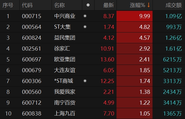 上证报中国证券网讯 1月8日,零售板块异动拉升,截至9时47分,中兴商业拉升封板,益民集团、徐家汇、欧亚集团、大连友谊等跟涨。