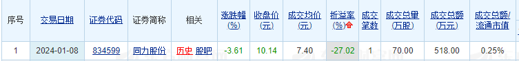 同力股份昨日大宗交易成交70万股 折价率27.02%