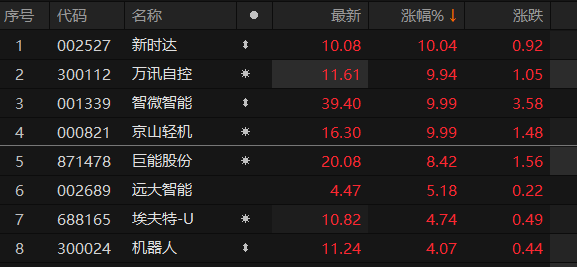 上证报中国证券网讯 1月9日早盘,机器视觉概念股走高,截至10时00分,新时达、智微智能、京山轻机涨停,万讯自控涨近10%,巨能股份、远大智能等跟涨。