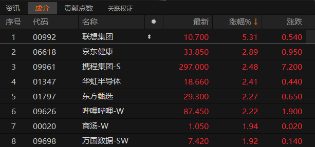 上证报中国证券网讯 1月9日早盘,恒生科技指数震荡回升,截至10时7分,该指数涨0.77%。成分股中,联想集团涨超5%,京东健康、携程集团、华虹半导体、东方甄选、哔哩哔哩涨逾2%,商汤等跟涨。