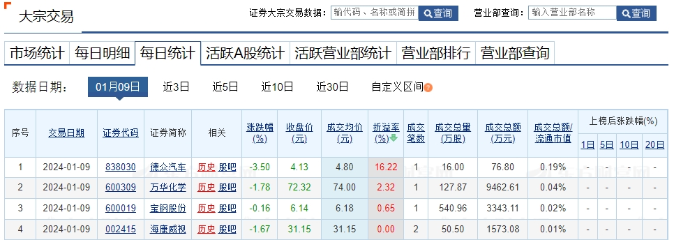 上证报中国证券网讯 据东方财富Choice数据,昨日(1月9日)A股共77只个股发生大宗交易,总成交23.93亿元。德众汽车、万华化学、宝钢股份溢价率居前;锦波生物、科润智控、*ST西域折价率居前。