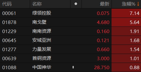 上证报中国证券网讯 1月10日上午交易时段,港股煤炭板块多数上涨。9时58分,绿领控股涨超7%,南戈壁涨超5%,南南资源、安域亚洲等跟涨。