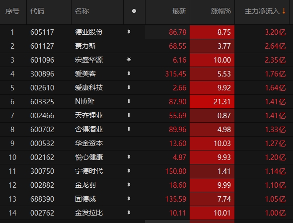 3只A股主力资金净流入超2亿元 德业股份超3亿元居首