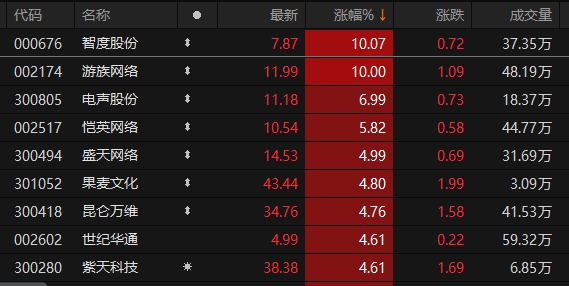 A股传媒板块走高 智度股份、游族网络涨停