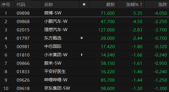 恒生科技指数震荡走低 微博、小鹏汽车等跌幅居前
