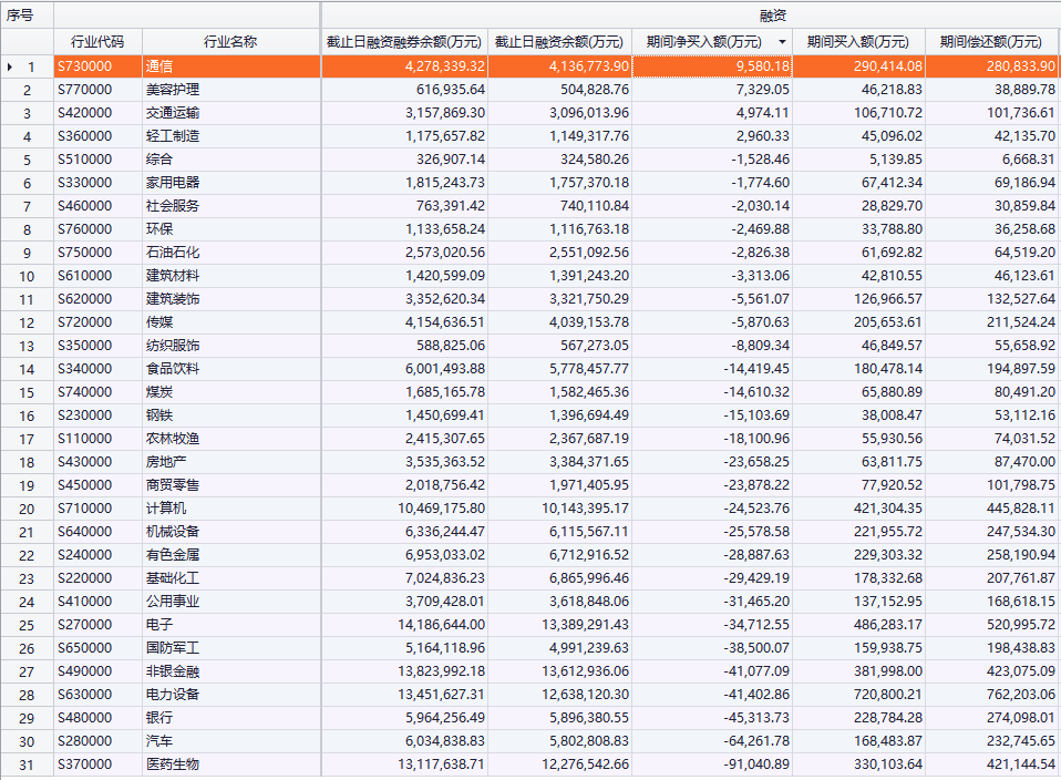 上证报中国证券网讯 Choice数据统计,昨日沪深两市融资余额15598.11亿元,相比前一日净卖出67.34亿元。4大行业获融资资金净买入,27行业净流出;通信净买入金额居首,为0.96亿元,美容护理净买入0.73亿元,交通运输净买入0.5亿元;医药生物净流出居首,为9.1亿元,汽车净流出6.43亿元,银行净流出4.53亿元。
